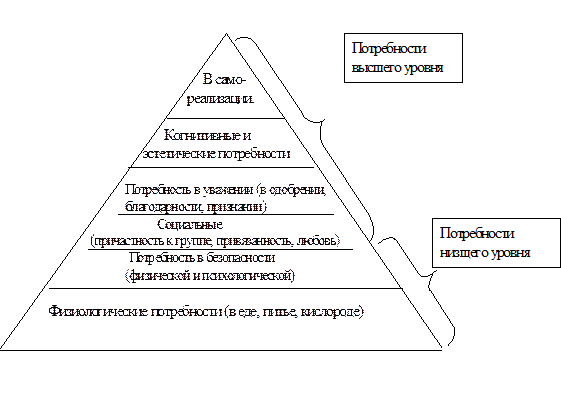 Рис. 1. Иерархия потребностей (по А.Маслоу). Рассмотрим все пять уровней иерархии потребностей Маслоу. 1. Физиологические потребности. Состоят из основных, первичных потребностей человека, иногда даже неосознанных. Иногда, в работах современных исследователей, их называют биологическими потребностями. Применительно к рабочей среде, это потребности в заработной плате, отпуске, пенсионном обеспечении, перерывах, благоприятных рабочих условиях, освещении, отоплении и вентиляции. 2. Потребность в безопасности. Как только физиологические потребности удовлетворены, на передний план выходит потребность в безопасности. Эти потребности отражают желание сохранить уже полученные награды и положение и защитить себя от опасности, вреда, угроз, травм, потерь или лишений. В организациях эти потребности имеют форму борьбы служащих за безопасность работы, введения системы старшинства, организацию профсоюзов, безопасные условия работы, дополнительные льготы, страховку и выходное пособие. 3. Социальные потребности. Когда достигнуто удовлетворение физиологических потребностей и потребностей в безопасности, внимание человека перемещается на потребность в дружбе, любви и принадлежности. Как «социальные животные», люди испытывают желание нравиться другим и хотят удовлетворить свои социальные потребности на работе. Это происходит путём вхождения в формальные и неформальные рабочие группы, путём сотрудничества с другими рабочими и принятия участия в разнообразной совместной деятельности. 4. Потребности в уважении. Эти потребности могут принимать две различные формы. Первая - это потребность в самоуважении, т.е. удовлетворение самим собой. Самоуважение тесно связано с чувством достижения цели, компетентности, знаний, зрелости и зависимости. Вторая форма - потребность в уважении других людей. Эта потребность связана с репутацией, общественным признанием, статусом внутри группы. В любой организации награды, которые могут удовлетворить потребность в уважении, включают в себя почётные звания, другие формы признания, похвалы, дополнительные обязательства и продвижение по службе. 5. Потребности в самореализации и в самовыражении. Когда удовлетворены потребности четырёх нижних уровней, человек фокусирует своё внимание на удовлетворении потребности в самореализации. Пытаясь этого достичь, люди стараются реализовать весь свой потенциал, увеличить свои способности и быть «лучшими». Такая потребность в самовыражении является самой высокой из всех человеческих потребностей. Значение потребностей заключается в том, что они формируют мотивации, стимулирующие деятельность организма для сохранения жизни индивида и вида, добиваться высоких показателей в производственной и научной деятельности, в спорте, совершать открытия и т.п., а также играют воспитательную роль. Мотивация - это побуждение организма к действию с целью удовлетворения существу ющей у него потребности (биологической, социальной свободы или исследовательской деятельности). Выделяют две стадии мотивации: состояние организма и за пуск деятельности организма для удовлетворения потребности. Потребность первична, мотивация вто рична. Виды мотиваций. Мотивации подразделяют обычно на три груп пы: биологические, социальные и идеальные (этические, духов ные). Мотивации делят такж