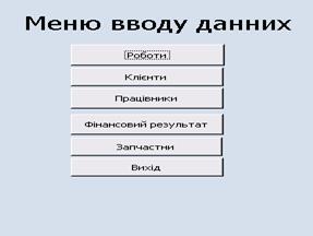 Натиснувши кнопку «Вихід» ми тим самим перейдемо до «Головної форми» Розглянемо тепер кнопку «Ввід даних», після її натиснення з’являється «Ввід даних»