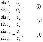 мұ ндағ ы υ 2 мен υ 3-пластинкалардағ ы жарық тың таралу жылдамдық тары, υ 1-жарық тың пластинканы қ оршағ ан ортадағ ы таралу жылдамдығ ы. Пластинканың беттері ө зара параллель болғ андық тан: 1 = 2; 2 = 3. Сондық тан (1) мен (2) тең дікті мү шелеп кө бейтіп, одан шық қ ан нә тижені (3) тең дікпен мү шелеп кө бейтсек, сонда мынадай тең дік шығ ады: