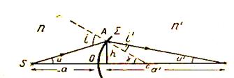4-сурет.Параксиаль сјулелердіѕ бір сфералыќ бетте сынуы Осы SA сә улесі параксиаль сә уле болсын. Сонда тек и бұ рышы ғ ана емес и', у, і, і' бұ рыштары да ө те кішкене бұ рыштар болады. Сфералық беттің 0 тебесінен бастап, оптикалық остің бойымен оң жақ ка қ арай (жарық тың таралатын бағ ыты бойынша) салынатын кесінділерді оң таң балы, сол жақ қ а қ арай салынатыи кесінділерді теріс таң балы деп санаймыз. Бұ рыштap бас оптикалық остің немесе сфералық бетке тү сірілген нормаль бағ ытынан бастап ө лшенеді. Егер олар сағ ат тілі бағ ыты бойынша алынса, оң таң балы деп, оғ ан қ арсы бағ ыт бойынша есептелінсе, теріс таң балы деп санаймыз. Осы ереже бойынша тү су бұ рышы, шағ ылу бұ рышы жә не тү скен сә уле мен оптикалық ос арасындағ ы бұ рыш теріс таң балы, сынғ ан сә уле мен оптикалық ос арасындағ ы бұ рыш жә не шекаралық беттің қ исық тық радиусы мен оптикалық ос арасындағ ы бұ рыш оң таң балы болады. Осы айтылғ ан таң ба ережесін сақ тағ анда жарық тың сыну заң ы былай жазылады: