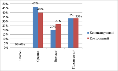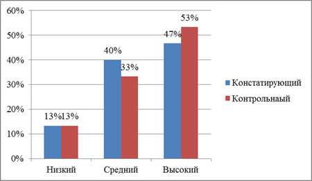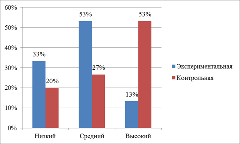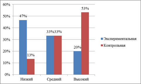 Выявлено, что уровень агрессивности в экспериментальной группе несколько уменьшился. Теперь высокий уровень имеют 20% участников экспериментальной группы и 53% участников контрольной группы. Изменение показателей в контрольной группе (рост показателей) обуславливается фактором естественного развития группы. Средний уровень выражен у 33% участников как контрольной, так и экспериментальной группы. Низкий уровень агрессивности выявлен у семи (47%) участников экспериментальной группы и у двух участников контрольной группы исследования (13%). Соотношение представлено на рисунке 5.