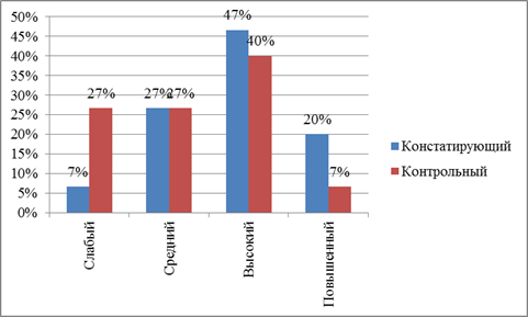 У 40% участников экспериментальной группы диагностируется и у 27% участников контрольной группы диагностируется высокий уровень агрессивности. Повышенный уровень диагностируется у 33% участников контрольной группы и у 7% участников экспериментальной группы. Средний уровень агрессивности выявлен у 27% участников экспериментальной группы и у 40% участников контрольной группы, как преимущественно и на констатирующем этапе исследования. Изменения показателей также может рассматриваться как фактор естественного развития группа. Проверка достоверности различий позволяет оценить степень воздействия формирующего этапа исследования. Низкий уровень агрессивности диагностируется у 27% участников экспериментальной группы исследования. Соотношение представлено на рисунке 6.