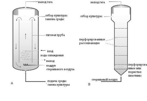 Рис.3. Ферментеры с пневматическим перемешиванием: а) эрлифтный; б) пузырькового типа