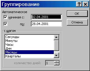 Щелкните по кнопке Группировать на инструментальной панели Сводные таблицы. Появится диалоговое окно Группирование. .