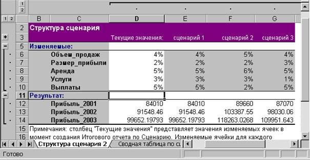 Замечание. Ссылки должны разделятся символом «;» – «точка с запятой». Щелкнуть по кнопке «Ok». На экране появится рабочий лист «Структура сценария» с таблицей примерно следующего вида: