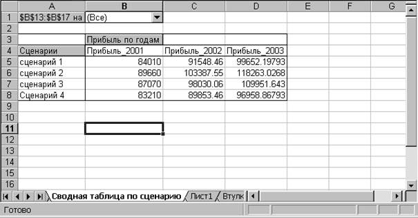2. Присвоить имена ячейкам результата С11, D11, E11 – «Прибыль_2001», «Прибыль_2002», «Прибыль_2003»