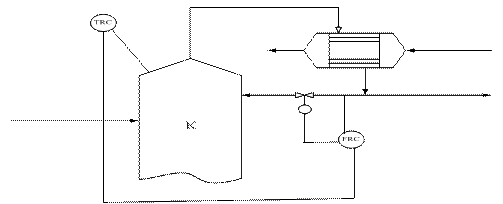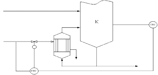 Если температуры кипения НКК и ВКК близки, конденсация паров, выходящих из ректификационной колонны, производится раздельно. В дефлегматоре конденсируются только ВКК, конденсат отделяется в сепараторе от парожидкостной смеси и возвращается в колонну. Пары НКК проходят ч/з дефлегматор и сепаратор, а затем конденсируются в конденсаторе. Для того, чтобы в дефлегматоре конденсировался только ВКК, необходимо поддерживать постоянной температуру парожидкостной смеси, выходящей из дефлегматора, с помощью АСР температуры. Регулирующее воздействие осуществляется изменением расхода хладагента, подаваемого в дефлегматор. Давление в ректификационной колонне стабилизируется в этих случаях путем изменения расхода хладагента в конденсатор.