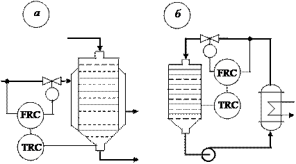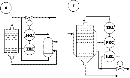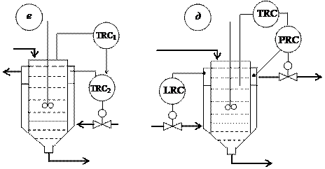 Рис.2. Схемы автоматического регулирования температурного режима химических реакторов. е) по температуре в рубашке д) по давлению кипящего хладоагента в рубашке.