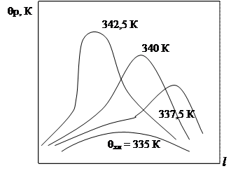 Трубчатые реакторы обычно используют для проведения газофазных высокоэкзотермических процессов. В трубчатых реакторах возможны режимы, при которых велика параметрическая чувствительность реактора, т.е. незначительные колебания параметров процесса – расхода смеси через реактор, температуры хладагента, начальных значений концентраций реагентов, их начальной температуры и др. приводят к существенным изменениям температурного профиля по длине реактора. При этом температура в реакторе может оказаться значительно больше допустимой, и будет соответствовать аварийному режиму работы. На рис. 9 приведены температурные профили для трубчатого реактора полимеризации этилена в области qхл = 337-343 К.
