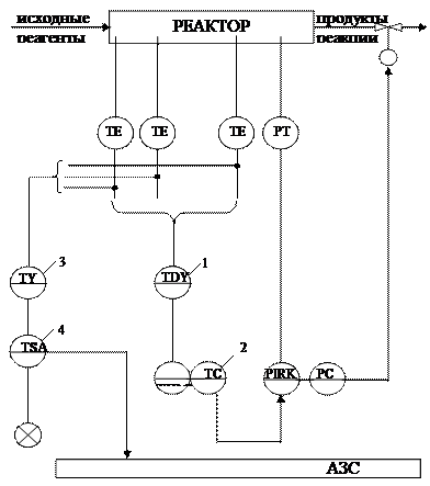 Рис. 8 АСР температуры в трубчатом реакторе и АСЗ. 1- блок выбора max 2- регулятор температуры 3- блок выбора максимума температуры 4- блок аварийной сигнализации.
