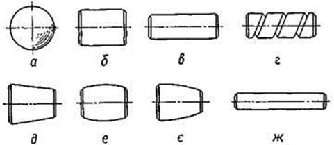 2.За числом рядів тіл кочення – одно–, дво– та чотири– рядні. 3. За способом компенсації перекосів вала – несамоустановні та самоустно–вні сферичні. Самоустановні підшипники допускають перекоси кілець до 2–3°, завдяки чому мо жуть працювати при збільшених деформаціях валів і при неспіввісному розміщенні отворів під підшипники в окремих опорах вала. 4. За радіальними розмірами підшипники кочення з одним і тим же внутрішнім діаметром d ділять на 5 серій діаметрів (надлегка, особливо легка, легка, середня та важка) і на 5 серій ширин (особливо вузька, вузька, нормальна широка, особливо широка). Співвідношення розмірів підшипників різних серій показано на рис. 3 (а – особливо легка серія; б – легка; в – легка широка; г – середня; д – се редня широка; е – важка серія).