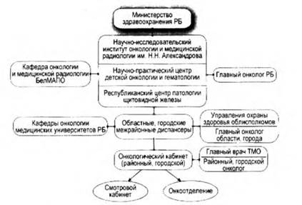 Онкологическая служба страны находится в подчинении Министерства здравоохранения и представлена научно-исследовательским институтом онкологии и медицинской радиологии им. И.И. Александрова, четырьмя областными онкологическими диспансерами (Брестский, Витебский, Гомельский, Могилевский}) онкологическими отделениями Гродненской областной клинической больницы и семью городскими и межрайонными диспансерами (Барановичский, Бобруйский, Випейский, Минский, Мозырский, Пинский, Полоцкий). Специализированную онкогематологическую помощь детям оказывает Республиканский научно-практический центр детской онкологии и гематологии, а больным раком щитовидной железы - Республикансуий научно-практический центр опухолей щитовидной железы. В сельских и городских районах имеются онкологические кабинеты, возглавляемые районным (городским) онкологом (районных онкологов в республике - 115). Важную роль в оказании онкологической помощи населению играют кафедры онкологии в БелМАПО и медицинских ВУЗах страны. Для оказания специализированной онкологической помощи в республике развернуто 3830 коек, в том числе 130 - в центре детской онкологии. 356 онкологов и 150 радиологов (среди них 29 докторов медицинских наук и 74 - кандидата медицинских наук). Научно-исследовательский институт онкологии и медицинской радиологии М3 Республики Беларусь (НИИО и МР М3 РБ) им Н.Н. Александрова возглавляет и координирует все виды деятельности онкологической службы в области организации противораковой борьбы и фундаментальных исследований и осуществляет: • научно-методическое руководство онкологической сетью республики; • повышение квалификации врачей-онкологов и врачей общей лечебной сети; • оказание консультативной помощи больным; • оказание специализированной помощи больным; • клинико-экспериментальные исследования в области онкологии. Оказание специализированной помощи при всех видах онкологической патологии осуществляют 14 стационарных и 11 клинико-диагностических отделений Онкологический диспансер. Основным структурным подразделением онкологической службы республики является областной онкологический диспансер, который находится в ведении территориального отдела здравоохранения.
