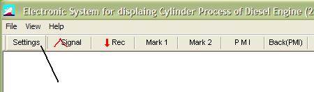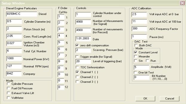 Рис. 5. Информационное окно системы, вызываемое функцией «Settings» из главного меню В информационном окне заполнить следующие данные. 1. Марка двигателя. 2. Диаметр цилиндра. 3. Ход поршня. 4. Длина шатуна. 5. Объем камеры сжатия. 6. Число цилиндров двигателя. 7. Номинальная (паспортная) мощность двигателя. 8. Компания - разработчик двигателя. 9. Порядок работы цилиндров. Последовательно для каждого из цилиндров записать порядок его работы (запись выполняется последовательно для цил.1, цил.2, цил.3…, не следует использовать альтернативную форму, в которой записывается порядок работы цилиндров). 10. Число измерений для функции «Signal» (составляет от 2000 до 4900). 11. Число измерений для функции «Record» (составляет от 3000 до 4900). 12. Дата проведения лабораторной работы. 13. Указатель необходимости автоматической компенсации дрейфа нуля датчика (не устанавливается, так как компенсация будет осуществляться ручным способом). 14. Давление наддува, соответствующее режиму работы двигателя. 15. Указатель фазирования процесса без датчика ВМТ (на основе анализа самой индикаторной диаграммы) – не устанавливается. 16. Уровень триггера сигнала – не вводится. 17. Указатель подключения датчика отметки углового положения коленчатого вала – установить. 18. Указатель Канал 1 (Channel 1) – установить. Далее в (под)окне «ADC calibration» водятся данные по калибровке датчика (эти данные вводит лаборант на основе результатов, полученных при испытаниях датчика и усилителя на гидравлическом стенде). 19. Уровень напряжения, снимаемый с предусилителя, при нулевом давлении на датчике. 20. Уровень напряжения, снимаемый с усилителя при давлении 100 бар на датчике. 21. Специальная константа (Frequency Factor), которая регулирует скорость компьютера при взаимодействии его с блоком аналого-цифрового преобразования (подбирается опытным путём преподавателем). 22. Пауза (Pause) – можно ввести «0». 23. Указать тип режима (Mode) - «Давление в цилиндре» («Cylinder pressure»). 24. Указать тип режима «Run» (в противном случае система будет функционировать в режиме эмуляции /тестирования программного обеспечения /). Остальные параметры информационного окна служат для проведения тестирования работы системы и в лабораторной работе не используются. После ввода параметров закрыть информационное окно (мышкой «нажать» OK).