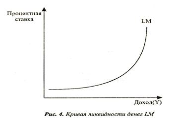 Денежный рынок – это рынок, на котором спрос на деньги и их предложение определяют уровень процентной ставки, это сеть институтов, обеспечивающих взаимодействие спроса и предложения денег. Равновесие на денежном рынке устанавливается, когда спрос на деньги равен их предложению, что может быть достигнуто при определенной банковской процентной ставке. Сохраняться равновесие на денежном рынке будет в том случае, когда процентная ставка будет изменяться в том же направлении, что и доход. Например, если доходы в экономике возрастут, то это приведет к росту спроса на деньги, а следовательно, к увеличению процентной ставки, в этом случае будет увеличиваться альтернативная стоимость хранения денег и снижаться курс ценных бумаг, что уменьшит спекулятивный спрос на деньги, увеличит покупку фирмами и домашними хозяйствами финансовых активов и даст возможность поддерживать денежный рынок в равновесном состоянии. При снижении доходов возникает обратная ситуация. Графически данное условие можно изобразить в виде кривой ликвидности денег LM, известной как модель Хансена (рис. 4). Увеличение предложения денег в экономике приводит к понижению банковской процентной ставки.