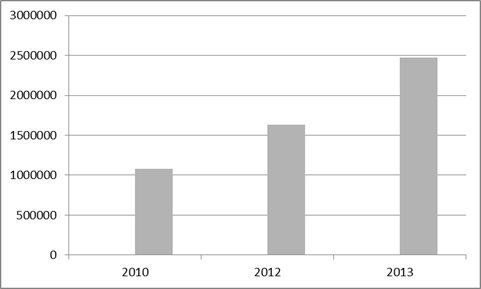 Дефицит. Бюджет Владимирской области в 2013году исполнен с дефицитом 2476171, 8тысяч рублей. В законе об исполнении бюджета за 2013год определена сумма доходов 39646762, 6 тысяч рублей, а сумма расходов составляет 42122934, 4тысяч рублей. Динамика дефицита бюджета нарисована на рис.2.3.1.В 2012году обьем дефицита бюджета составил 1634013 тысяч рублей, в 2011году был профицит областного бюджета, в 2010году-1082263, 5 тысяч рублей.
