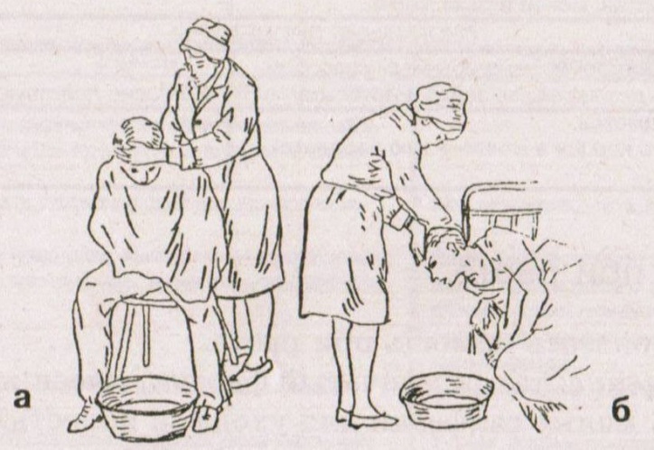 Рис. 1 Уход за пациентом при рвоте: а - положение пациента сидя; Осложнения: 1. Обезвоживание организма при упорной рвоте, гиповолемия, 2. Гипохлоремия (при нарушении водно-солевого обмена), гипокалиемия, гипонатриемия. Эти обменные расстройства приводят к нарушениям сердечной деятельности, функций почек, а иногда и к расстройствам сознания и параличам. 3. Длительна и сильная Р. может вызывать образование надрывов слизистой оболочки желудка (чаще всего в области перехода с пищевода на желудок) с массивными кровотечениями — так называемый синдром Маллори — Вейеса. 4. У ослабленных лиц (особенно у детей и пожилых), а также у больных с нарушенным сознанием возможна аспирация рвотных масс с последующими дополнительными осложнениями (расстройства дыхания, аспирационная пневмония).