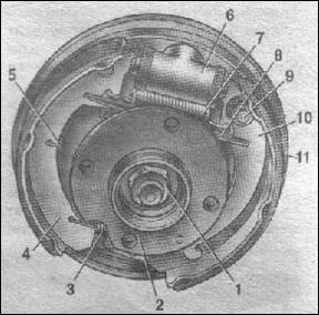 Рис.2: Тормозной механизм заднего колеса: 1 – гайка крепления ступицы; 2 – ступица колеса; 3 – нижняя стяжная пружина колодок; 4 – тормозная колодка; 5 – направляющая пружина; 6 – колёсный цилиндр; 7 – нижняя стяжная пружина; 8 – разжимная планка; 9 – палец рычага привода стояночного тормоза; 10 – рычаг привода стояночного тормоза; 11 – щит тормозного механизма. 1.2.3 Колёсный цилиндр