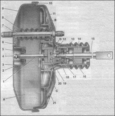 Рис.6: Вакуумный усилитель: 1 – шток; 2 – уплотнительное кольцо фланца главного цилиндра; 3 – чашка корпуса усилителя; 4 – регулировочный болт; 5 – уплотнитель штока; 6 – возвратная пружина диафрагмы; 7 – шпилька усилителя; 8 – уплотнительный чехол; 9 – корпус усилителя; 10 – диафрагма; 11 – крышка корпуса усилителя; 12 – поршень; 13 – защитный чехол корпуса усилителя; 14 – воздушный фильтр; 15 – толкатель; 16 – возвратная пружина толкателя; 17 – пружина клапана; 18 – клапан; 19 – втулка корпуса клапана; 20 – буфер штока; 21 – корпус клапана; А – вакуумная камера; В – атмосферная камера; С, D – каналы. Таблица неисправностей Вибрация при торможении.