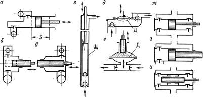 Рис. 6.3. Схемы гидравлической части возвратно-поступательных насосов По расположению в пространстве они, как и другие насосы, делятся на горизонтальные и вертикальные. По выполнению рабочего органа насосы бывают: поршневые; уплотнение связано с поршнем и плотно прилегает к обработанной поверхности цилиндра (рис. 6.3, а); плунжерные; плунжер полированный, уплотнительный узел связан с гидравлической коробкой (рис. 6.3, б, в)или имеется щелевое уплотнение Щ большой протяженности (рис. 6.3, г); диафрагменные; упругая диафрагма Д приводится в движение механически (рис. 6.3, д)или гидравлически (рис. 6.3, е). В последнем случае она служит перегородкой, разделяющей перекачиваемую жидкость, содержащую абразивные частицы, от чистой, омывающей трущиеся детали в насосной камере. При бурении скважин и на нефтегазопромыслах применяют главным образом поршневые и плунжерные насосы. Существует предел уменьшения диаметра поршня для штока данного диаметра из-за невозможности разместить узел уплотнения в узком кольцевом пространстве между стенкой цилиндра и штоком. В плунжерном насосе эта задача решается проще, так как в неподвижное плунжерное уплотнение легко подавать смазку и его можно периодически подтягивать, компенсируя изнашивание. По числу поршней или плунжеров различают насосы: одно-, двух-, трех- и многопоршневой (плунжерный), а по числу плоскостей, в которых расположены оси рабочих органов - одно-, двух- и многорядный. 1 Чем меньше поршней (плунжеров), тем проще схема насоса и тем меньше сменных деталей, что очень важно в условиях интенсивного их износа. С другой стороны, увеличением рядов, в которых использованы стандартные детали, достигается повышение подачи и равномерности движения жидкости в трубопроводах (см. §). Существенный признак устройства насоса - число тактов нагнетания и всасывания за двойной ход рабочего органа (род действия): - в насосе одностороннего действия (см. рис. 6.3, а, б) рабочий орган выполняет одно всасывание и одно выталкивание, изменение объема насосной камеры Vs - FS, где F и S - соответственно площадь и длина хода поршня (плунжера); - в насосе двухстороннего действия (рис. 6.3, ж, и) жидкость всасывается и нагнетается два раза, так что в двух насосных камерах VS = FS +(F-f)S = (2F - /) S, В терминах, начинающихся со слова «много», допускается замена слова на цифровую приставку (например, «шестиплунжерный»).