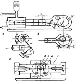 Рис. 6.4. Схемы прямодействующих насосов Управление золотниками выполняется по-разному. У двухрядных насосов оно перекрёстное: золотник в одном ряду движется при помощи рычажной передачи поршневым штоком другого ряда и наоборот. Золотник соединяется со своим штоком не наглухо, а с продольным зазором. Благодаря зазору при перемене направления движения в движении поршней возникает пауза, что благоприятствует работе клапанов. Однорядный насос обычно имеет вспомогательный золотник, управляющий главным. …..Вскважинном гидроприводном насосе (рис. 6.4, б) вспомогательным золотником служит поршневой шток, на котором в верхней и нижней частях делаются продольные канавки для прохода рабочей жидкости. В данный момент поршневая группа движется вниз. Когда канавка 1 сообщит полость 3 с областью высокого давления D, золотник 2 переместится в верхнее положение, остановит поршни, а затем откроет выход жидкости из камеры В. При последующем подъеме поршней канавка 4 соединит полость 3 с областью низкого давления H, и золотник сместится в нижнее положение. В этом агрегате насос 5 - дифференциальный. Существуют однорядные гидроприводные насосы, предназначенные для цементирования скважин, работающие на чистом масле от регулируемого силового насоса. Не исключена возможность применения таких насосов при бурении скважин. …….Вальные насосы, признаком которых является вращательное движение ведущего звена (вала), различаются механизмом передачи движения к рабочим органам: кривошипный - с кривошипно-шатунным механизмом и кулачковый - с кулачковым механизмом. В отличие от прямодействующего насоса, имеющего постоянную скорость движения поршня на большей части хода, движение поршня вального насоса неравномерное. В зависимости от положения кривошипа или кулачка скорость поршня изменяется от нуля в мертвых точках до максимума (у середины хода). Соответственно изменяется расход жидкости в трубопроводах, примыкающих к рабочей камере. Для выравнивания подачи жидкости кривошипы (или кулачки) в многорядных насосах смещены относительно друг друга на некоторый угол. В двухрядных насосах этот угол равен 90°, в трехрядных - 120°, в m – рядных - В зависимости от расположения рабочих органов п о отношению к ведущему звену различают возвратно-поступательные насосы: односторонний (оси рабочих органов параллельны и расположены на одной стороне привода); оппозитный (на одной оси по обе стороны привода); V-образный (на двух пересекающихся осях на одной стороне привода); звездообразный (на нескольких пересекающихся осях). Наиболее распространены односторонние кривошипные (рис. 6.5, а) насосы, приводной механизм которых состоит из трансмиссионного вала, получающего вращающий момент через трансмиссию от двигателя, зубчатого редуктора и коренного вала, связанного с шатунами посредством собственно кривошипов, эксцентриков, пальцев или колен. Реже используется схема с червячной передачей (рис. 6.5, в). Этот вид передачи удобен для привода насоса от вала, расположенного вдоль оси насоса, например, на автомобиле. В оппозитном насосе (рис. 6.5, г)нагрузка на коренной вал и коренные подшипники меньше, чем в одностороннем насосе, так как усилия, действующие по двум противолежащим штокам, взаимно уравновешиваются. При вращении коренного вала 2 с эксцентриками 3 крейцкопфная рама 4 