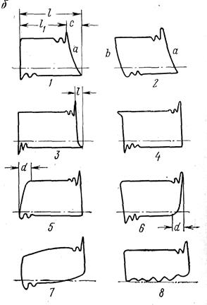 Рис. 7.2. Индикаторные диаграммы поршневого насоса В координатах s, p схематически она имеет вид прямоугольника 1 – 2 – 3 – 4. При движении поршня вправо (рис. 7.2, а) давление в камере p1 ниже атмосферного pa, что объясняется гидравлическими потерями во всасывающем тракте, а также возможным расположением насоса над уровнем жидкости во всасывающем резервуаре. В точке 1 поршень изменяет направление движения на обратное, всасывающий клапан автоматически закрывается, и в камере резко увеличивается давление до p2, превышающего давление в начале нагнетательной линии pk (точка 2). Это превышение обусловлено перепадом давления в нагнетательном клапане. В крайнем левом положении поршень снова меняет направление движения. При этом давление резко падает по линии 3 – 4, нагнетательный клапан K2 закрывается, и открывается всасывающий клапан K1. Действительная диаграмма отличается от схематической наклоном линий подъёма 1 – 2 и спада давления 3 – 4, что обусловлено сжимаемостью перекачиваемой жидкости и упругой деформацией стенок рабочей камеры. На форму линий 2 – 3 и 4 – 1 влияют колебания давления на входе и выходе насоса, а также изменения гидравлического сопротивления в клапанах. Индикаторные диаграммы – средство, во-первых, установления состояния и технической диагностики действующего насоса и, во-вторых, определения индикаторной мощности с целью нахождения баланса мощностей. Для диагноза неисправностей снятую индикаторную диаграмму сопоставляют с эталонной и выявляют отклонения от нормы. Примеры искажённых диаграмм представлены на рис. 7.2, б. 1 – вместе с жидкостью по линии a сжимается газ (например, воздух в случае всасывания из открытого резервуара). Подача насоса уменьшается в пропорции к отношению длин l1 и l, так как на отрезке c происходит сжатие воздуха; 2 – в рабочей камере вследствие неправильной конструкции образуется газовый мешок. Всасывающий клапан открывается после того, как газ в мешке расширится по линии b, вследствие чего также снижается подача насоса; 3 – запаздывание с посадкой всасывающего клапана, пропускающего жидкость на отрезке l, в результате чего задерживается возрастание давления в рабочей камере; 4 – при запаздывании с закрытием нагнетательного клапана задерживаются спад давления в цилиндре и открытие всасывающего клапана; 5, 6 – неплотность клапанов (перетекание жидкости особенно заметно около мёртвых точек на участках d диаграмм); 7 – насос работает без пневмокомпенсаторов или при их неэффективном действии (вследствие удалённости от рабочей камеры, недостаточного объёма газа в компенсаторе); 8 – жидкость неравномерно подходит к насосу при давлении выше атмосферного. Площадь индикаторной диаграммы пропорциональна работе поршня, совершённой за один двойной ход. Действительно, при ходе вправо (см. рис. 7.2, а) на поршень действует переменное давление p1. Текущая сила, действующая на поршень, составляет p1F, среднее её значение за ход p1, срF, а работа Алгебраическая сумма названных работ – индикаторная работа: