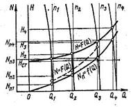 Рис. 7.3, а. Теоретические и действительные Рис. 7.3, б. График совместной работы характеристики напора при n = var поршневого насоса и трубопровода