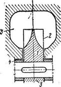 Рис. 9.6. Рабочее колесо с уравновешенной осевой силой 1 – рабочее колесо с симметричным сечением; 2 – рабочие лопасти; 3 – отвод симметричного сечения; 4 – дистанционные втулки