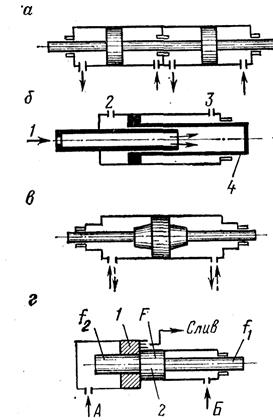 В зависимости от направления действия рабочей жидкости различают гидроцилиндры двухстороннего (рис. 10.1, а, б, б, д, е) и одностороннего (рис. 10.1, г, ж) действия. У первых движение выходного звена под действием рабочей жидкости возможно в двух направлениях, а у вторых - только в одном, а возврат звена происходит за счет силы пружины, силы тяжести и пр. Гидроцилиндры классифицируются также в зависимости от устройства рабочей камеры: поршневой (рис. 10.1, а, б, в), плунжерный (рис. 10.1, г), телескопический (рис. 10.1, д), мембранный (рис. 10.1, е), сильфонный (рис. 10.1, ж). Поршневой гидродвигатель может быть с односторонним (рис. 10.1, а) или с двухсторонним штоком, расположенным по обе стороны поршня (рис. 10.1, б, в). Представляют практический интерес следующие специальные конструкции поршневых гидроцилиндров: Тандем-цилиндр (рис. 10.2, а) применяют при больших нагрузках в случае, если длина цилиндра не ограничена, а диаметр его должен быть небольшим. Гидроцилиндр со ступенчатым поршнем предназначен для получения нескольких скоростей. Схема на рис. 10.2, б позволяет иметь три прямых скорости цилиндра 4 (при подаче жидкости с постоянным расходом Q в канал 1 или в канал 2 или в оба одновременно) и одну обратную скорость (подача в канал 3). Гидроцилиндр с торможением снабжен устройством для торможения выходного звена в конце хода и предупреждения жесткого удара движущихся частей о концевой упор. Демпфер простейшего типа показан на рис. 10.2, б. Гидроцилиндр с фиксацией положения поршня в промежуточном между крайними положениями представлен на рис. 10.2, г. Если обе полости А и Б сообщить с источником подачи жидкости, то плавающий поршень 1 будет перемещаться вместе с поршнем 2 вправо до тех пор, пока не упрется в уступ цилиндра. В этом положении шток фиксируется разностью сил давления р(F – f1 - f 2). Под телескопическим цилиндром в общем случае понимают цилиндр, общий ход штоков которого превышает длину корпуса цилиндра. Его применяют для получения большого хода при ограниченном пространстве в транспортном положении, например, в качестве домкрата для подъема и спуска вышек в буровых и нефтепромысловых агрегатах.