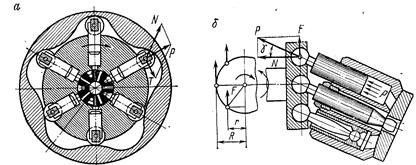 а у двигателя максимальный крутящий момент и соответствующие давления и силы трения на опорных поверхностях возникают уже при пуске. Для улучшения пусковых свойств гидромотора особенно важно заменять скольжение качением и сохранять смазочный слой на трущихся поверхностях при запуске. В частности, для использования шестеренного насоса в качестве гидромотора необходимо уменьшить зазоры в подшипниках, обеспечивая этим радиальный зазор между шестернями и корпусом для предотвращения их касания при пуске под нагрузкой. Принцип действия гидромотора любого вида аналогичен принципу действия поворотного гидродвигателя (см. рис. 10.3, а). Под давлением жидкости на входное звено (поршень, пластину, зуб шестерни, винт или другой подвижной элемент) возникает усилие, тангенциальная составляющая Т которого создает момент относительно оси вращения ротора. Вращающий момент от каждого входного звена зависит от положения последнего, поэтому и суммарный мгновенный момент всех тангенциальных сил пульсирует подобно суммарной подаче жидкости при работе той же машины в режиме насоса. Выражение среднего значения вращающего момента можно получить в общем виде, пользуясь, например, схемами радиально-поршневого кулачкового гидромотора пятикратного действия (рис. 10.4, а)или аксиально-поршневого гидромотора с наклонным блоком (рис. 10.4, б).