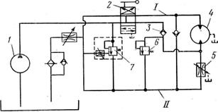 Рис.Рис. 11.7. Схема гидросистемы дроссельного управления лебёдкой [10] Принудительный спуск (при незначительной массе снаряда в начале спуска). Распределитель 2 в нижнем положении, насос нагнетает жидкость по линии 1 через гидромотор 4 и дроссель 5 на слив. Чтобы проволока не разматывалась при встрече с препятствием, предохранительный клапан 7 настроен на малое давление, необходимое лишь для преодоления трения в опорах барабана и трансмиссии лебедки. …… //////«Удар в в е р х». После принудительного спуска груза распределитель 2 переключается в положение подъема, а дроссель 5 резко закрывается. По индикатору наблюдается увеличение натяжения проволоки, а затем резкое снижение, свидетельствующее о срыве снаряда. Клапан 7 ограничивает натяжение проволоки.