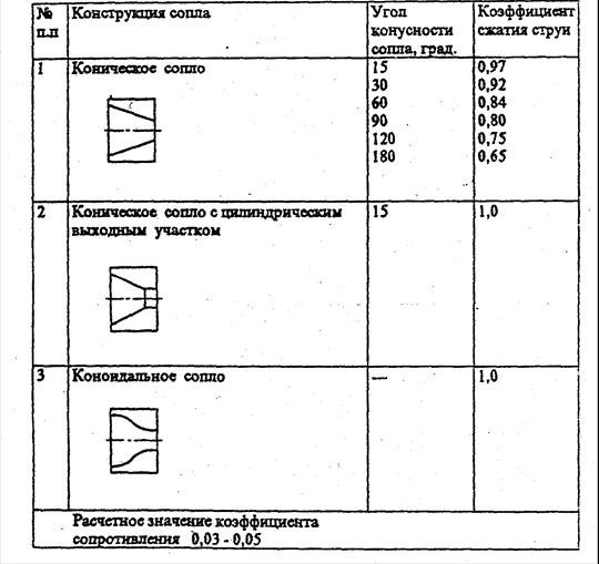 Чтобы обоснованно производить выбор значений других коэффициентов рассмотрим подробнее отдельные элементы струйного насоса. Сопло струйного насоса представляет собой сужающийся в направлении течения жидкости канал. Связь между параметрами потока жидкости можно установить, используя уравнение Бернулли: