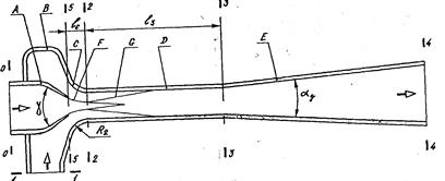 Рис. 1.1 Схема струйного насоса: A – сопло, E – диффузор, B – приёмная камера, F – сжатый участок струи, C – входной участок, G – граница струи. D – камера смешения,