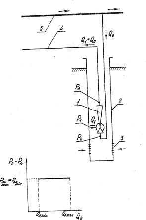 Требуется спроектировать струйный насос при подаче рабочей жидкости из магистрального напорного трубопровода (силовая насосная установка обеспечивает стабильность рабочего перепада давления при изменении расхода рабочей жидкости через сопло струйного насоса). Расчеты провести, исходя из условия работы струйного насоса с максимальным КПД. Из двух возможных равноценных вариантов решения задачи выбрать тот, где диаметр камеры смещения больше. В данной задаче последнее условие связано с необходимостью расширения каналов для прохода твердых частиц, имеющихся в перекачиваемой жидкости. Описание насосной установки. На расчетной схеме рис.5.4 показан струйный насос 1, размешенный в скважине 2 и служащий для добычи воды. Добываемая вода через перфорационные отверстия 3 в обсадной колонне поступает в приемную камеру струйного насоса. В данном примере рабочая жидкость в струйный насос подается из напорного магистрального трубопровода 5. Рабочая и добываемая жидкости перемешиваются в струйном насосе и отводятся в сборный трубопровод 4. На схеме показан участок характеристики силовой установки, служащей для перекачки жидкости по магистральному трубопроводу и для подачи рабочей жидкости к струйному насосу (разность давлений в напорном магистральном трубопроводе и сборном трубопроводе остается постоянной при изменении расхода рабочей жидкости через сопло струйного насоса). Исходные данные к расчету. Условиями эксплуатации определены значения выходных параметров проектируемого струйного насоса и силовой установки, подающей рабочую жидкость к струйному насосу: давление струйного насоса -0, 9 МПа; расход перекачиваемой жидкости -3, 0 л/с; плотность жидкости -1000 кг/м3; коэффициент сжатия струи -1, 0; максимальное давление силового насоса -2, 5 МПа; минимальное давление силового насоса -2, 5 МПа; (в пределах рассматриваемого участка характеристики силового насоса максимальное и минимальное давления равны); максимальная подача силового насоса -5, 0 л/с; минимальная подача силового насоса -1, 0 л/с. Для расчета используем программу № 2. Соблюдая принятую для расчетов размерность параметров, вводим в ЭВМ исходные данные в такой последовательности: 0, 003 1, 0 0, 005 0, 001
