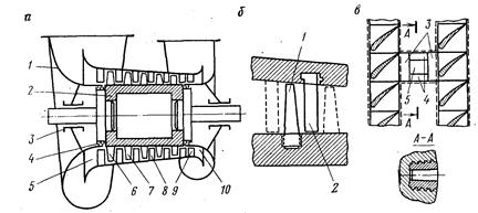 Рис. 13.19. Осевой компрессор а – схема компрессора; б – ступень; в – замковый паз; 1 – корпус; 2 – ротор; 3 – подшипники; 4 – уплотнения; 5 – входной конфузор; 6 – входной направляющий аппарат; 7 – рабочий венец; 8 – напра- вляющий венец; 9 – спрямляющий аппарат; 10 – выходной дифф- узор