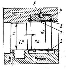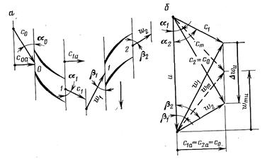 Ступень компрессора состоит из двух рядов (венцов) лопастей ротора и статора. Во входном направляющем аппарате перед первой ступенью поток закручивается в ту же сторону, что и направляющих аппаратах ступеней. Из последнего спрямляющего аппарата поток выходит в осевом направлении. Вместе с объёмом сжимаемого газа уменьшается высота лопастей в венцах. В первых ступенях отношение диаметра втулки к диаметру корпуса обычно бывает dв / dк = 0, 5 – 0, 7, а в последних ступенях 0, 7 – 0, 9. Применяют преимущественно две схемы проточной части: а) с постоянным диаметром корпуса, б) с постоянным диаметром ротора. Схема а позволяет снизить число ступеней, так как при прочих равных условиях средний диаметр проточной части в этой схеме больше, чем в схеме б, и, следовательно, мощность каждой ступени выше. Поэтому схему а применяют там, где в особенности необходимо уменьшить габариты и массу машины. Схема б удобна и проста для изготовления, и поэтому она более приемлема для компрессоров стационарных установок. Лопасти осевого компрессора. Высокая эффективность осевых компрессоров (в некоторых машинах КПД превышает 0, 91) достигнута применением аэродинамически совершенных лопастных аппаратов. Устройство ступени показано на рис. 13.19, б. Лопасти ротора 1 пилообразным хвостом с зубцами заводятся в кольцевую канавку ротора через замковый паз, соединённый с двумя смежными канавками (рис. 13.19. в). После установки лопастей в замок вставляются последовательно вставки 3, 4 и клин 5. Лопасти статора 2 вставляются в корпус непосредственно (см. рис. 13.19, б) либо крепятся к бандажным лентам, изогнутым в виде полуколец и образующим две половины вставного направляющего аппарата. Тип лопастных аппаратов осевых компрессоров определяются по степени реактивности. Скорости потока в лопастных аппаратах осевой машины (компрессора, вентилятора, насоса) удобно изображать на общем чертеже (полигоне скоростей) – рис. 13.20.1