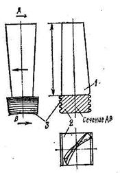 Минимальная высота лопасти последней ступени приблизительно равна 40 мм. Изменение длины лопасти в направлении движения газа приводит к изменению характерного для осевых машин значения втулочного отношения ν = dвт / dк. Для первых ступеней ν вх = 0, 5 – 0, 8, для последних ν вых = 0, 7 – 0, 9. Выясним особенности геометрических типов компрессоров, определяемых условиями (13.41). 1) dвт = const; dк = var. В этом случае втулка – цилиндрическая и изготовление её несложно. Корневые части и крепления рабочих лопастей всех ступеней во втулке совершенно одинаковы. Последние лопасти в этом варианте имеют при прочих равных условиях длины, большие, чем в варианте с dк = const. В этом легко убедиться, составляя уравнения неразрывности для обоих вариантов и полагая осевые скорости одинаковыми. Увеличенная длина лопастей хвостовых ступеней уменьшает потери энергии в них. 2) dвт = var; dк = const. В этой схеме упрощаются обработка корпуса и крепление в нём направляющих лопаток. Упрощаются и являются более надёжными обработка и пригонка внешних концов рабочих лопастей. Благодаря этому допускаются меньшие радиальные зазоры между концами рабочих лопастей и внутренней поверхностью корпуса, что повышает объёмный КПД ступеней. Окружные скорости лопастей в этом случае выше, чем при dвт = const; это увеличивает работу ступеней, и при заданной степени сжатия компрессора число ступеней получается меньшим, чем в первом случае. Недостатком этой конструктивной схемы применительно к малым подачам являются малые длины лопастей хвостовых ступеней: КПД хвостовых ступеней снижается. Кроме рассмотренных схем построения проточной полости иногда применяют и другие схемы с dвт = var и dк = var, не имеющие, однако, преимуществ перед рассмотренными. Для стационарных осевых компрессоров применяют в большинстве случаев схему с dвт = const. Существенное влияние на энергетическую эффективность осевого компрессора оказывает аэродинамика подводящего и отводящего каналов. Они конструируются, как правило, в виде спиральных и осевых каналов переменного сечения (конфузоров и диффузоров). Рассмотрим конструктивные формы рабочих и направляющих лопастей и способ их крепления во втулке и корпусе компрессора. Лопасти осевых компрессоров в редких случаях являются цилиндрическими. Обычно они рассчитываются с переменным по длине коэффициентом реактивности или по условию rcu = const. Это приводит к изменению угла установки элементов лопасти по её длине, и лопасть получается винтовой. Корневое сечение лопасти 1 жёстко сопрягается с сухарём 2, служащим для закрепления лопасти во втулке. Лопасть и сухарь обычно выполняются из одного куска металла; в некоторых случаях свариваются. Боковые грани сухаря имеют криволинейные рифы (зубцы) 3 для крепления в канавках, проточенных во втулке. Сухари вводятся в канавку через специальный замковый колодец и разводятся по канавке до плотного соприкосновения торцовыми плоскостями (рис. 13.22).
