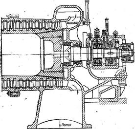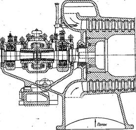 Компрессор выполнен с постоянным внутренним диаметром корпуса (см. рис. 13.21, б). Корпус имеет разъём в горизонтальной плоскости. Подвод и вывод воздуха – в осевом направлении. Ротор массивный, большой массы. Подшипники скользящего трения. Восприятие осевой силы – упорным подшипником, расположенным со стороны двигателя. Для облегчения технологии корпуса входная и выходная крышки его выполнены отъёмными. Уплотнения вала на входе и выходе гребёнчатые. Конструкция в целом типична для стационарных компрессоров. Рисунок 13.25 даёт представление о конструкции стационарного осевого компрессора. Компрессор выполнен по схеме с постоянным диаметром ротора и коническим корпусом. Подвод и отвод воздуха в поперечном направлении снизу через патрубки, составляющие одно целое с левой и правой половинами корпуса. Ввиду большой длины корпуса он выполнен из двух половин, стыкующихся в плоскости, нормальной к оси вала.