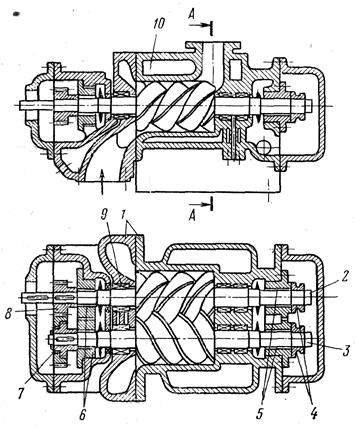 Рис. 17.5. Винтовой компрессор с охлаждаемым корпусом: 1 – корпус, 2 – ведущий ротор, 3 – ведомый ротор, 4 – упорные подшипники, 5, 6 – опорные подшипники, 7, 8 – шестерни связи, 9 – уплотнения, 10 – полости для охлаждения