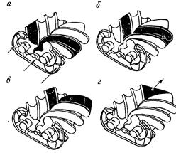 Рис. 17.6. Последовательность рабочего процесса в компрессоре: а – всасывание, б – сжатие, в – окончание сжатия, г – выталкивание газа