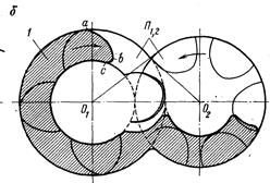 При вращении винтов объём нижней части полости увеличивается, благодаря чему обеспечивается всасывание газа, а объём верхней части уменьшается, вследствие чего сначала происходит сжатие газа, а затем выталкивание (когда у заднего торца данная полость достигает нагнетательного окна). В момент, когда зуб ведомого ротора начинает входить в полость П 1 ведущего ротора (рис.17.7, а), объём её начинает сокращаться. Вначале темп сокращения очень невысокий, поэтому отсечку полости от всасывающего окна по кромке abc (рис.17.7, б) задерживают до тех пор, __________________________ 1Термин «линия контакта зубьев» - условный, так как в действительности контакта между винтами может и не быть. пока в результате соединения впадин обоих винтов не начнёт образовываться парная полость П 1, 2 (чтобы не было потерь при соединении пространств с различными давлениями).