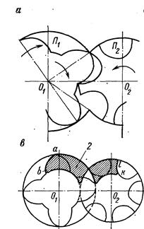 Рис. 17.8. Профили роторов винтовых компрессоров: а – с цевочным зацеплением; б – асимметричный; в – эллиптический
