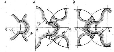 Начиная с этого положения, в сокращающейся изолированной полости П 1, 2 происходит сжатие до момента, когда задание сечения полости не достигнут кромок нагнетательного окна ab и k1 (рис. 17.7, в). Степень сжатия, определяющая внутреннее повышение давление газа в полости, зависит от положения кромок нагнетательного окна по отношению к началу сжатия. Профили зубьев подбираются с таким расчётом, чтобы при взаимной обкатке винтов их зубья сопрягались теоретически без зазора. Были исследованы различные зубья – симметричного и асимметричного профиля с циклоидальным, круговым и эллиптическим профилем, корригированные и без коррекции. Большинство заводов – изготовителей выпускает компрессоры с ц е в о ч н ы м зацеплением, т. е. таким, у которого круговой профиль зуба очерчен из центра, расположенного на делительной окружности винта (рис. 17.8, а). Достоинство кругового профиля – возможность выполнить точную обработку зуба и иметь малые зазоры, что важно дляы достижения хорошей герметичности полостей. Недостатки – малое сечение впадины, ослабление зуба и острые грани у ведомого винта, негерметичность в осевом сечении.