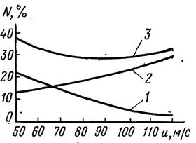 Рис. 17.9. Потери мощности (в % от адиабатической) в зависимости от окружной скорости: 1 – от внутренних перетечек; 2 – газодинамические потери; 3 – суммарные потери