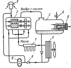 Рис. 17.10. Схема установки маслозаполненного компрессора 1 – воздушный фильтр; 2 – компрессор; 3 – маслосборник; 4 – предохранительный клапан; 5 – маслоотделитель второй ступени; 6 – маслохолодильник; 7 – масляные фильтры; 8 – обратный клапан; 9 – масляный насос