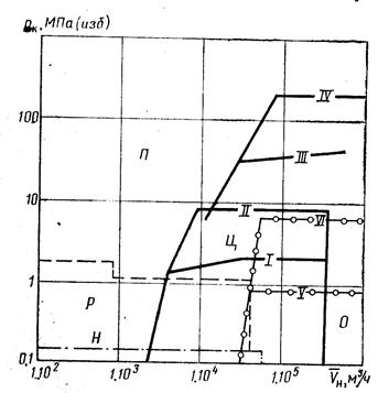Рис. 18.1. Области применения компрессоров: П – поршневых; Р – роторных; Ц – центробежных; О – осевых; Н – коловратных нагнетателей (типа Рутс)
