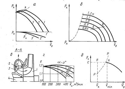 Линии всех характеристик 1, 2, 3, … сходятся в одной точке, поскольку при закрытой задвижке на выходе дросселиование на входе не имеет значения. При дросселировании критическая точка характеристики k смещается влево. Поэтому при запуске и остановке машины, чтобы избежать работы в помпажной зоне, следует закрывать дроссель, а затем манипулировать с задвижкой на выкиде. 3. И з м е н е н и е ч а с т о т ы в р а щ е н и я. После характеристик машины при различных частотах вращения (рис. 18.3. б) может быть использовано для определения и поддержания той частоты вращения, при которой компрессор подаёт необходимое количество газа при заданном противодавлении (по пересечению линии AB потребных режимов с кривыми p к - 4. П о в о р о т л о п а с т е й н а п р а в л я ю щ е г о а п п а р а т а (рис. 18.3, в). При закручивании потока газа перед входом в рабочее колесо с помощью лопастей скоростью c 0u может иметь, как положительное, так и отрицателное значение. Скорость c 0u, согласно уравнению Эйлера, изменяет удельную работу рабочего колеса, а следовательно, и характеристику ε - 5. П о в о р о т л о п а с т е й д и ф ф у з о р а. При изменении угла установки лопастей диффузора и уменьшении входного угла наклона лопастей диффузора и уменьшении входного угла наклона лопастей α 2л граница помпажа отодвигается в сторону меньших значений 6. П е р е п у с к г а з а. Для устойчивой работы компрессора при малых расходах газа (за границей помпажа) применяется перепуск газа на вход в компрессор (или выпуск в атмосферу). При уменьшении подачи непосредственно перед границей зоны помпажа P – P (точка A на рис. 18.3, д) открывается клапан, выпускающий часть газа из нагнетательной линии. При этом потебитель получает количество газа в объёме