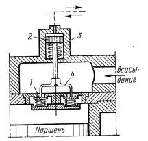 Рис. 18.6. Схема устройства для отжима всасывающего клапана 4. О т ж и м в с а с ы в а ю щ и х к л а п а н о в производится вилкой, действующей на пластину клапана. На схеме (рис.18.6) вилка 4 связана с поршнем 2, находящимся в цилиндре 3 и нагруженным пружиной. К цилиндру подводится газ из области нагнетания. Поршень опускается, и вилка держит клапан 1 открытым до тех пор, пока давление на выкиде компрессора не снизится до нормального. Здесь осуществлено автоматическое прерывистое регулирование. Имеются также автоматические системы с плавным регулированием, обеспечивающим открытие клапана на части хода, а также устройства для отжима клапана вручную. По экономичности этот способ уступает рассмотренным выше, так как при отжатом клапане в цилиндре затрачивается некоторая мощность (см. рис. 18.4, г). 5. И з м е н е н и е х о д а п о р ш н я применяют в СПДК (см. рис. 14.4). При небольшом уменьшении хода поршня не только уменьшается описываемый им объём, но и увеличивается мёртвое пространство, вследствие чего достигается значительное снижение объёма всасываемого газа. 6. К о м б и н и р о в а н н о е р е г у л и р о в а н и е сочетает достоинства различных методов. Все виды ступенчатого регулирования могут бать дополнены дроссельным перепуском через обводную линию. Для сокращения числа дополнительных полостей применяют подъёмники всасывающих клапанов, которые также служат для разгрузки компрессора при пуске.