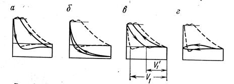 Рис. 18.4. Индикаторные диаграммы при регулировании: а – дросселированием во всасывающей линии; б – перекрытием всасывающей линии; в – включением дополнительной полости; г – отжимом всасывающего клапана