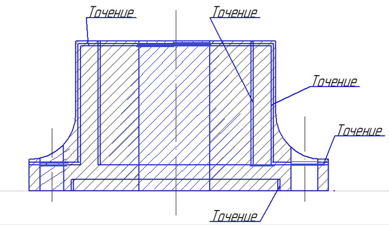Рисунок 4.3-Этап-точение На этапе сверления в цилиндрическом основании (рисунок 4.1) просверливаем четыре отверстия диаметром 16 мм. Далее просверлим центральное отверстие диаметром 39 мм. В четырех отверстиях дополнительно нарезается резьба.