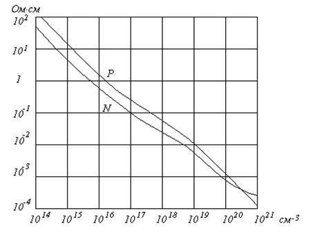 Рисунок 1 - График Ирвина. Зависимость удельного сопротивления от концентрации легирующей примеси для полупроводников N и P типа проводимости